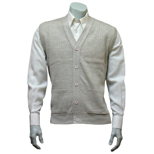 Mens sleeveless cardigan or knitted waistcoat in colour beige. Faint vertical self design down the front of the sweater.Two front pockets.Machine washable. 100% man-made fabric