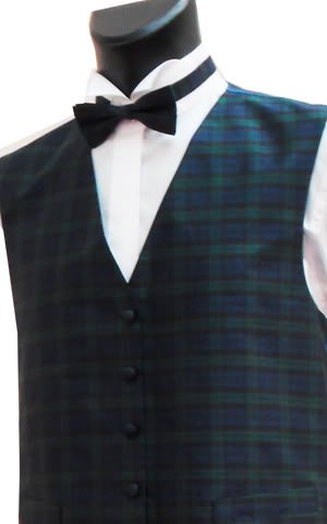 Blackwatch Tartan Waistcoat. 100% Shantung Silk Front (which has a Natural Random Slub Effect in Material). 100% Polyester back and lining. Mock Pocket Detail and 6 Covered Buttons to Front. Adjustable Back Strap.
