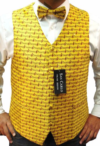FULL ALL ROUND BEAUTIFUL MUSIC NOTES PATTERN,SILKY SATIN POLYESTER,FULLY LINED BLACK COLOUR,FIVE FRONT BUTTONS(Music notes COLOUR),TWO FRONT POCKETS,BACK ADJUSTER STRAP SECURED WITH A SILVERED BUCKLE.