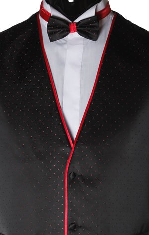 Party Waistcoat. Patterned Front Panels (Red Sparkle Dots with Matching Edge Piping. Plain Black Back. Matching Two Tone Bow Tie with Red Neckstrap.