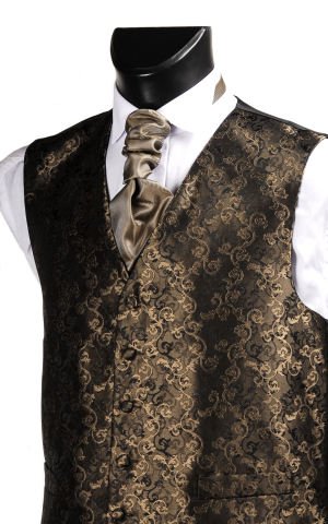 A beautifully made Dark Brown Fancy Patterned Waistcoat. 'Fancy' or 'Patterned' Waistcoats make a wonderful addition to either a wedding or prom. Cravats and Hankies available to match, please search After Sunset on Amazon