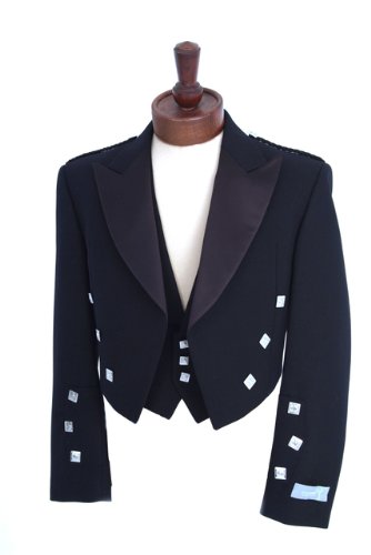 Mens Black Prince Charlie Jacket and Waistcoat. With Nickel Plated Buttons on Sleeves, Front and Back of Jacket. 100% Pure Wool with Satin Lapels.